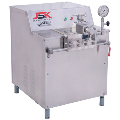 Homogenizer Machine Manufacturer Industrial Homogenizer Machine Capacities: 150 | 300 | 500 | 1000 LPH Engineered for dairies, ice‑cream plants, beverage lines, and general food processing, the JSK Machinery Homogenizer delivers consistent micronization and silky‑smooth product texture across every batch. From small craft operations to high‑volume production, our HM‑series covers four throughput ranges so you never pay for more machine than you need—yet always have room to grow. Why Choose JSK Homogenizers? Two‑Stage Homogenization Dual impact heads maximize fat‑globule reduction, improving overrun control in ice cream and giving beverages a stable, creamy mouthfeel. Food‑Grade Construction All contact parts and the full cladding are precision‑fabricated from SS‑304 for corrosion resistance and hygienic CIP cleaning. Rock‑Solid Pressure Control A hand‑wheel‑adjusted assembly, paired with a stainless‑steel diaphragm gauge, lets operators fine‑tune up to 400 PSI without pulsation. Long‑Life Fluid Ends Sterlite‑coated seat & ball valves stand up to abrasive particles and acidic recipes, cutting downtime and replacement costs. Heavy‑Duty Powertrain High‑strength eccentric shaft, forged connecting rods, and a splash‑lubrication system ensure smooth, vibration‑free operation shift after shift. | Model | Capacity (LPH) | Pistons | Motor Power | Max Pressure | | ------- | -------------- | ------- | ----------- | ------------ | | HM‑150 | 150 | 1 | 3 HP | 300 PSI | | HM‑300 | 300 | 2 | 5 HP | 300 PSI | | HM‑500 | 500 | 3 | 7.5 HP | 400 PSI | | HM‑1000 | 1000 | 3 | 10 HP | 400 PSI | Seamless Integration Every HM‑series homogenizer is supplied ready for CIP loops, PLC interfaces, and downstream filling lines—perfect for turnkey ice‑cream, yogurt, milk, juice, and sauce plants. Service Footprint We proudly install and support JSK Machinery equipment across Pune, Ahmedabad, Rajkot, Surat, Delhi, Chennai, Coimbatore, Bengaluru, Greater Noida, Hyderabad, Thane, Mumbai and throughout Maharashtra, Tamil Nadu, Gujarat, Karnataka, Uttar Pradesh.